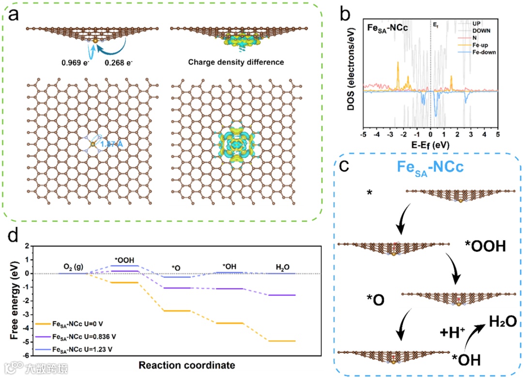DFT计算表明FeSA-NCc具有更强的电荷转移,这种电子调控既促进O2在Fe位点的吸附与O-O键断裂,又稳定了FeSA-NCc结构的Fe中心。DOS分析进一步揭示,FeSA-NCc中心铁原子的d轨道发生了正向偏移,使其更易获得电子。ORR自由能计算显示,在相同电位下,虽然FeSA-NCc在*OOH步骤存在微小能垒,但在*O/*OH/OH-步骤均优于平面Fe-N4。这些计算结果从热力学角度证实三维凹面FeN4结构能显著提升ORR性能,为实验现象提供了理论依据。