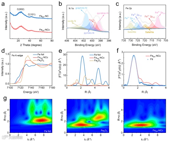 XRD图谱显示FeSA-NCc催化剂在25°和45°处出现石墨碳的(002)和(101)晶面衍射峰,且未检测到金属Fe峰,证实Fe以单原子形式存在。高分辨N 1s谱解析出吡啶N、Fe-Nx、吡咯N、石墨N和氧化N五种氮物种。XAS分析进一步验证了Fe物种的氧化态在0至+3之间,EXAFS拟合结果表明FeSA-NCc为Fe-N4配位形式。小波变换EXAFS在4.0 Å-1处的强度峰再次确证Fe的原子级分散特性。