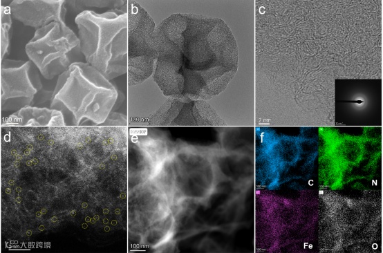 催化剂通过石墨相氮化碳(g-C3N4)模板导向结晶法制备。高分辨电镜分析表明,FeSA-NCc催化剂呈现独特的三维凹面结构,HRTEM与SAED分析显示材料具有高度石墨化的介孔特征,且未检测到金属纳米颗粒。AC HAADF-STEM图像中观察到高密度孤立Fe亮点,配合EDS元素分布,最终证实Fe以单原子形式均匀锚定在氮掺杂碳基体中。