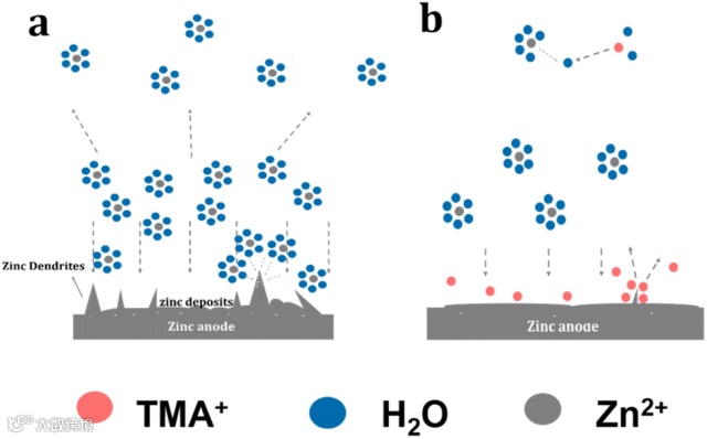 图1. 四甲基铵阳离子(TMA)调节电场力和竞争性溶剂化以优化水性锌离子电池的机制示意图:(a)BE电解质和(b)添加TMA+电解质。