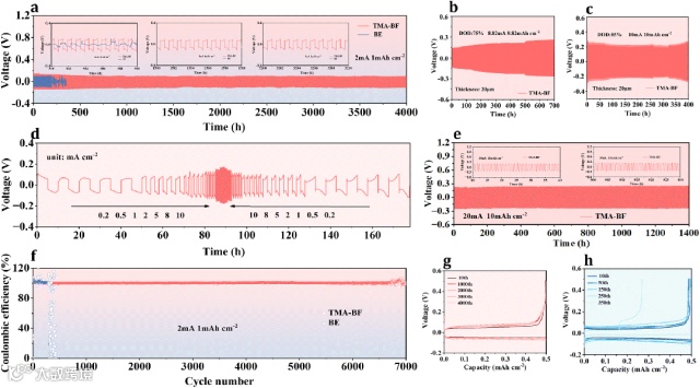 图5 不同电解质Zn‖Zn对称电池的电化学特性:(a)2 mA cm-2的循环性能; 深度放电条件下的循环性能:(b)DoD:75%和(c)DoD:85%;(d)倍率性能和(e)20 mA cm−2循环性能;(f)Zn‖Cu半电池的库仑效率; 不同电解质中的GCD曲线:(g)TMA-BF改性电解质和(h)BE。