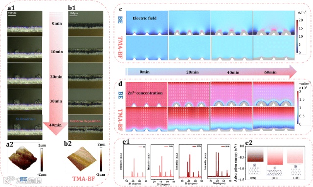 图4 添加TMA-BF电解质后:(a1)锌沉积过程的原位光学显微镜观察;(a2)循环后的AFM图像; BE电解质:(b1)锌沉积过程的原位光学显微镜观察和(b2)循环后的AFM图像;(c)电场的COMSOL仿真结果;(d)浓度场的COMSOL仿真结果;(e1)不同循环时间下Zn阳极的XRD图谱;(e2)TMA+在不同晶面上的吸附能模拟。