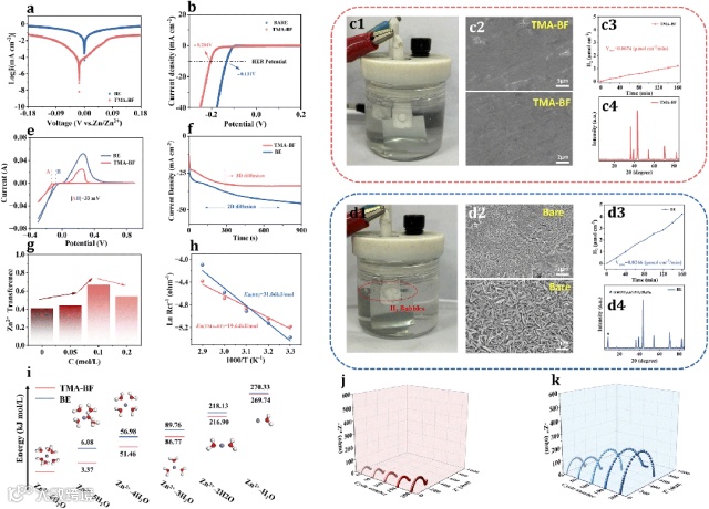图3 (a)塔菲尔曲线;(b)LSV曲线;加入TMA-BF电解质后:(c1)Zn‖Zn对称透明大电池,3 mA cm−2;(c2)Zn阳极SEM;(c3)产氢率;(c4)Zn阳极XRD;BE电解质:(d1)Zn‖Zn对称透明大电池,3 mA cm−2;(d2)锌阳极SEM;(d3)产氢率;(d4)锌阳极XRD;(e) CV曲线;(f) CA曲线;(g)Zn2+迁移率;(h) 活化能;(i)Zn(H2O)62+在两种电解质中;Zn‖Zn电池的EIS:(j)添加TMA-BF电解质和(k)BE电解质后。