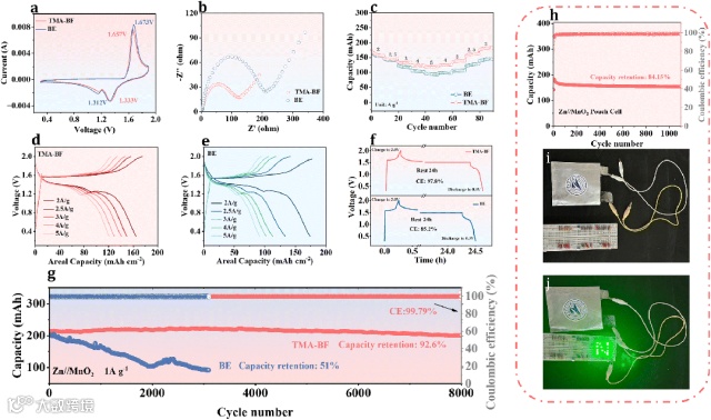 图6 不同电解质Zn‖MnO2全电池的电化学性能:(a)CV曲线;(b)EIS阻抗;(c)倍率性能;(d)TMA-BF电解质中的GCD曲线;(e)BE电解质中的GCD曲线;(f)自放电曲线;(g)1 A g-1时的循环稳定性;(h)采用TMA-BF电解质Zn‖MnO2软包电池的循环稳定性;(i和j)由软包电池供电LED显示的照片。