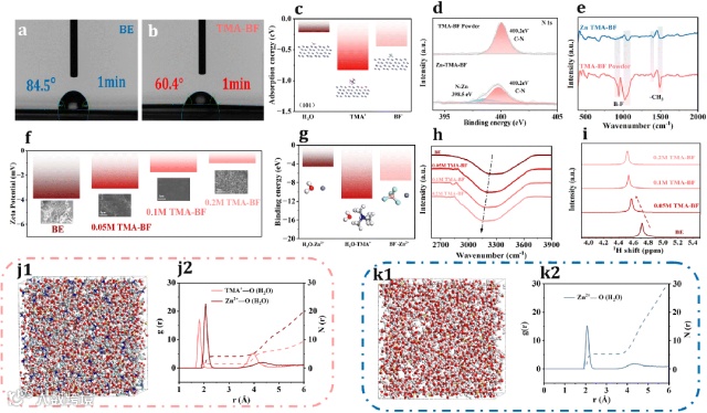 图2 不同电解质的接触角测试:(a)2 M硫酸锌(BE)和(b)添加TMA-BF;(c)不同分子在(101)晶面上的吸附能模拟;(d)浸入混合电解质和纯TMA-BF粉末中的锌片的XPS分析;(e)对浸入混合电解质和纯TMA-BF粉末中的锌片进行ATR-FTIR分析;(f)不同电解质浓度的zeta电位测试;(g)不同分子之间的结合能测试;(h)不同电解质浓度的FTIR分析;(i)1不同电解质浓度的 1H NMR 分析。加入TMA-BF后,电解液分子动力学模拟:(j1)模拟后的分子状态;(j2)配位数函数。BE电解质分子动力学模拟:模拟后的(k1)分子状态和(k2)配位数函数。