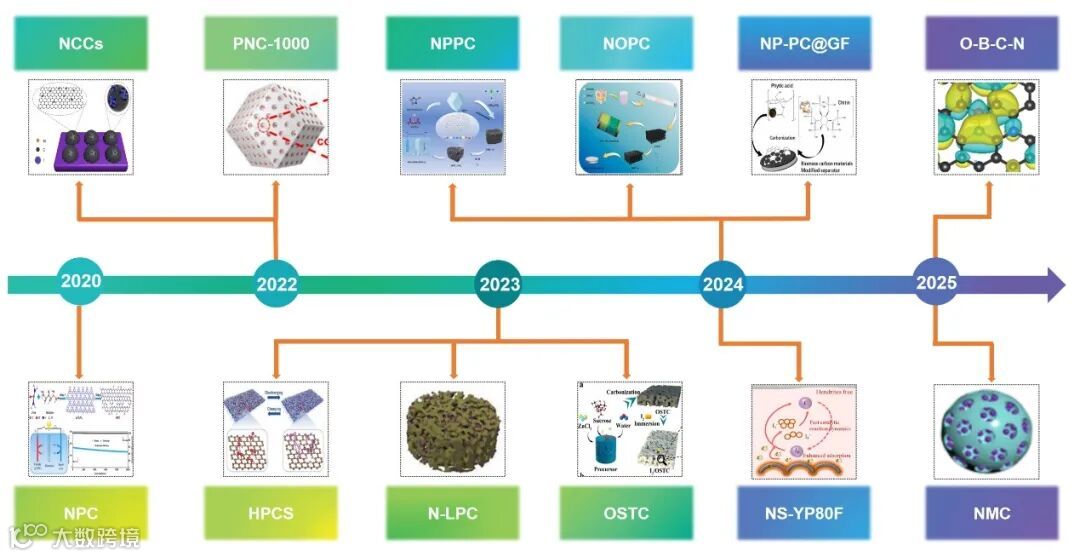 图5. 杂原子掺杂碳催化剂在Zn-I2电池中的最新进展。