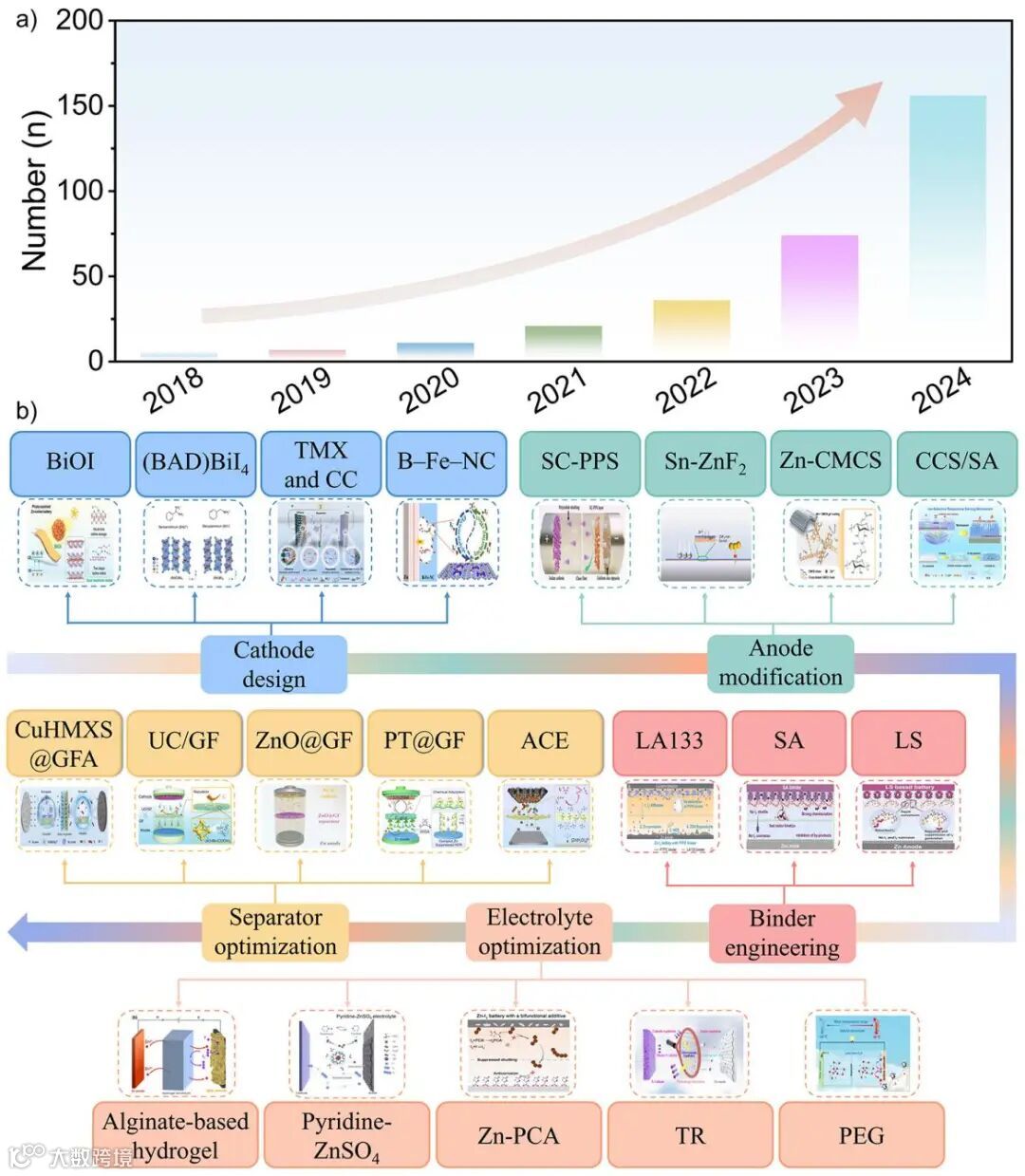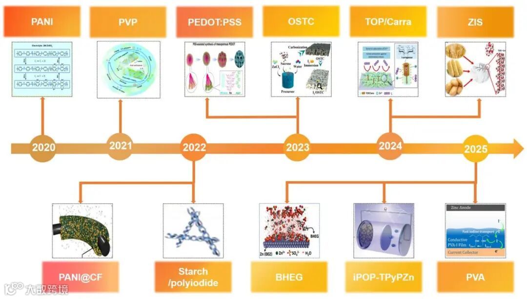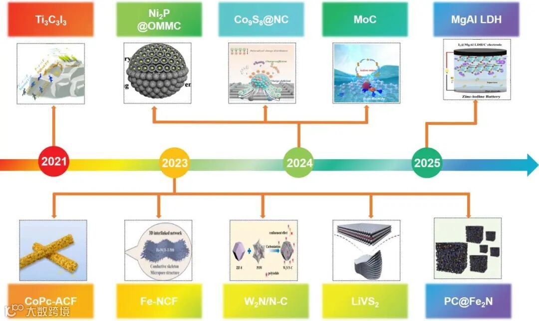 图1. 近年来关于Zn-I2电池的文献数量与典型策略的时间线及代表性研究成果