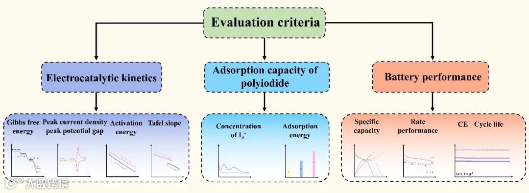 阴极电催化剂的评价标准主要包括电催化动力学行为、多碘化物吸附能力以及全电池的电化学性能。