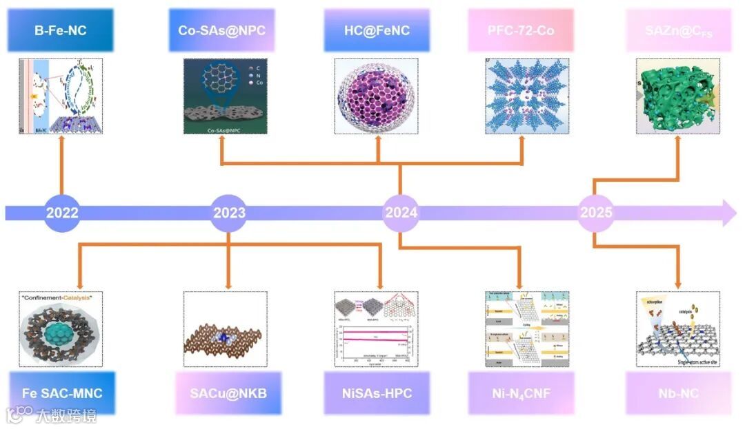 单原子催化剂(SACs)和双原子催化剂(DACs) 凭借其独特的几何和电子特性,能够增强对聚碘离子的吸附能力并降低碘还原反应的反应能垒,从而提升Zn-I₂电池的CE和循环寿命。金属中心及其配位环境对碘转化过程有着重要影响,这决定了反应的动力学行为和电化学可逆性。然而,许多SACs/DACs催化剂成本高昂,且制备工艺复杂,这阻碍了它们的大规模应用。此外, 原子级分散的催化剂在充放电过程中容易发生团聚和流失,导致容量衰减。而且, 大多数 SACs 和 DACs 主要以微孔结构为主,这可能会限制传质过程,进而影响Zn-I₂电池的性能。