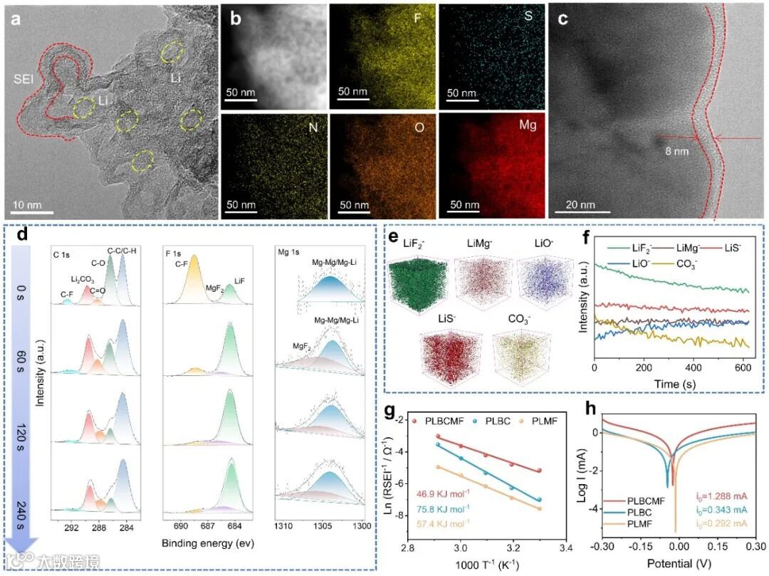 经过循环后MF与锂金属的原位转换反应形成富含LixMgy 和LiF等无机组分的稳定SEI,通过XPS和TOF-SIMS分析验证该SEI的组成。进一步的分析表明该SEI具有良好的锂离子传输动力学,而这将有利于提升电池的循环稳定性和倍率性能。