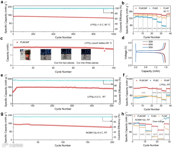 为验证PLBCMF电解质的实用性,分别组装LFP/Li和NCM811/Li全电池进行循环性能和倍率性能测试。LFP/Li在1 C下稳定循环1000次容量保持率达90%,且软包电池也具有良好的循环稳定性,在剪切状态下可点亮LED灯,体现了其优异的安全性能。特别是LFP/Li和NCM811/Li全电池能在室温条件下稳定循环,这一优异的性能充分体现了PLBCMF电解质的高离子电导率和良好界面兼容性的优势。