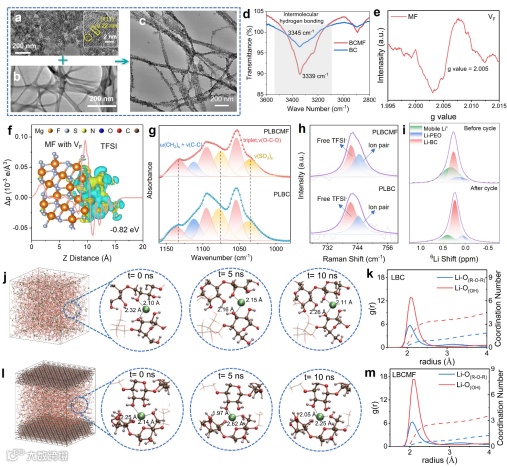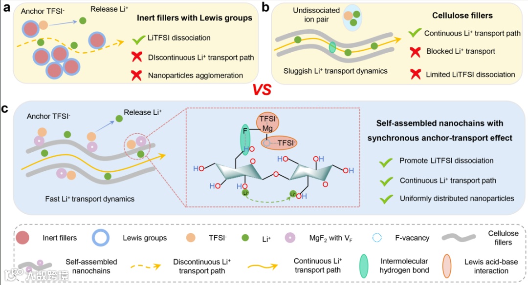 近日,武汉理工大学徐林教授团队在《Adv. Funct. Mater.》上发表题为“Self-Assembled Nanochains with Synchronous Anchor-Transport Effect Reinforced All-Solid-State Lithium-Metal Batteries”的文章。通过MgF2 (MF)与细菌纤维素(BC)间的分子间氢键作用自组装得到新型纤维素基纳米链BCMF,实现了MF颗粒的均匀分布,同时提升了BC的锂离子传输能力。该BCMF具有同步锚定锂盐阴离子和传输锂离子的作用,基于BCMF的聚合物电解质PLBCMF的离子电导率和对锂金属的稳定性得到显著提升。