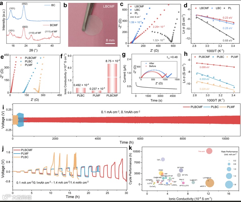 不含聚合物的BCMF自支撑电解质膜具有较高的室温离子电导率(2.29 × 10-4 S cm-1)和较低的活化能,体现了其优异的离子传输能力。含BCMF的复合电解质的室温离子电导率达到8.75 × 10-4 S cm-1,此外锂锂对称电池实现长达10000多小时的超长稳定循环,临界电流密度达1.4 mA cm-2。相比于近期已报道的复合电解质,PLBCMF的离子电导率、组装对称电池的循环性能及倍率性能均体现出极大的优势。