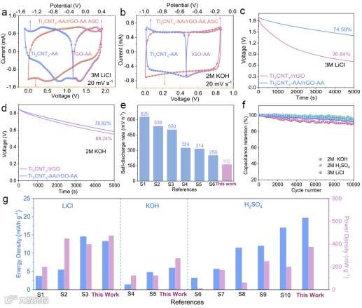 将 Ti3CNTx-1.5AA-20 和 rGO-2.0AA-30 组装成非对称超级电容器(Ti3CNTx-AA//rGO-AA)并与 Ti3CNTx//rGO 的开路电压(OCV)衰减曲线进行比较。从计算结果来看, vCNTx-AA//rGO-AA 的电压衰减仅为初始电压的 15.53%,而 vCNTx//rGO 的电压衰减则大得多,为 35.42%(按 100% - 64.58% 计算)(图5 d)。我们将这种自放电的抑制归因于 Ti3CNTx-1.5AA-20 电极表面羟基(-OH)基团密度的降低,正如 XPS 分析所证实的。如图 5h 所示, MXene 表面羟基基团密度越低,其功函数越高,零电荷电位(PZC)越正。在 ASC 中,尤其是当器件处于开路状态时,负极的 PZC 越高,水电解和法拉第反应的驱动力就越小,而这是导致自放电的主要因素。当Ti3CNTx//rGO的电解质分别为 2M H2SO4、3M LiCl 和 2M KOH 时,经过 10,000 次循环后,电容保持率分别为 95.0%、93.2% 和 89.8%,表现出优异的长期运行稳定性。当电解质为 2M H2SO4 时,该 ASC 能量密度达 19.7 mWh/g(图6f-g)。