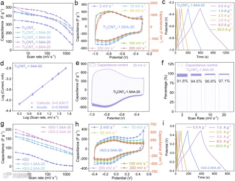 经 AA 分子和超声驱动得到的纤维状 Ti3CNTx 和 rGO 电极(Ti3CNTx-1.5AA-20 和rGO-2.0AA-30),因表面羟基减少、孔隙结构优化,其电容性组装的能、倍率性能和电荷存储动力学均得到显著提升,为后续组装高性能非对称超级电容器奠定了基础。在 2 mV/s 的扫描速率下,Ti3CNTx-1.5AA-20 的比电容高达 502 F/g(体积电容 717 F/cm³),显著高于原始 Ti3CNTx;即使在 2000 mV/s 的高扫描速率下,仍能保持初始电容的 51%,表现出优异的倍率性能(图4 a)。