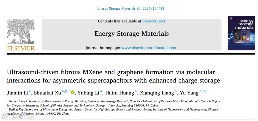 近日,来自广西大学的徐帅凯副教授、中国科学院北京纳米能源与系统研究所的杨亚研究员合作,在国际知名期刊Energy Storage Materials上发表题为”Ultrasound-driven fibrous MXene and graphene formation via molecular interactions for asymmetric supercapacitors with enhanced charge storage”的文章。