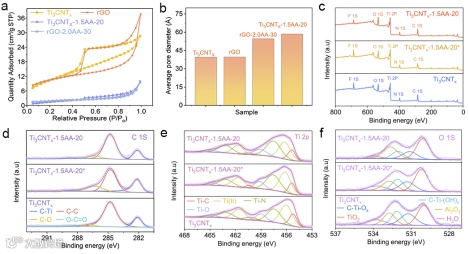 在 AA 与超声驱动的作用下,成功将 Ti3CNTx 和 rGO 纳米片制备成直径<5 μm的一维纤维结构(图2 a-f)。 XRD 图谱表明,Ti3CNTx-1.5AA-20 的(002)峰相较于原始 Ti3CNTx 向高角度偏移,表明层间距减小,可能与 AA 作用及纤维卷曲导致的层间堆叠更紧密有关(图2 g)。纤维状 Ti3CNTx-1.5AA-20 和 rGO-2.0AA-30 薄膜的平均孔径显著大于非纤维状的 Ti3CNTx 和 rGO (图 3b)。这种由卷曲纤维互联网络形成的更大孔径,有望在电极结构内部创造更开放的通道,从而促进电解质离子的快速扩散。X 射线光电子能谱(XPS)的高分辨率 O 1s 谱图(图 3f)为表面官能团的修饰提供了明确证据。与原始 Ti3CNTx 相比, Ti3CNTx-1.5AA-20 表面羟基(C-Ti-(OH)ₓ,约 531.8 eV)的峰强度显著降低。这有力地表明,抗坏血酸处理与退火处理有效去除了大部分表面羟基,而这预计会对电化学行为和自放电特性产生影响。