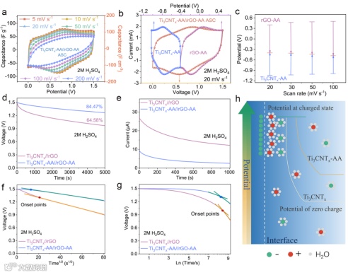图1. 通过 AA 和超声驱动的纤维状 Ti3CNTx / rGO 可促进离子传输并抑制自放电,从而用于高性能非对称超级电容器