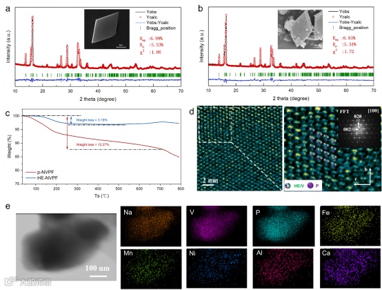 图1. HE-NVPF的结构与形态表征。(a) HE-NVPF和(b) p-NVPF的XRD Rietveld精修结果及SEM图像(插图),(c) HE-NVPF和p-NVPF的TGA曲线,(d) HE-NVPF的iDPC-STEM图像及相应的FFT,(e) HE-NVPF的BF-STEM图像及相应的EDS映射。