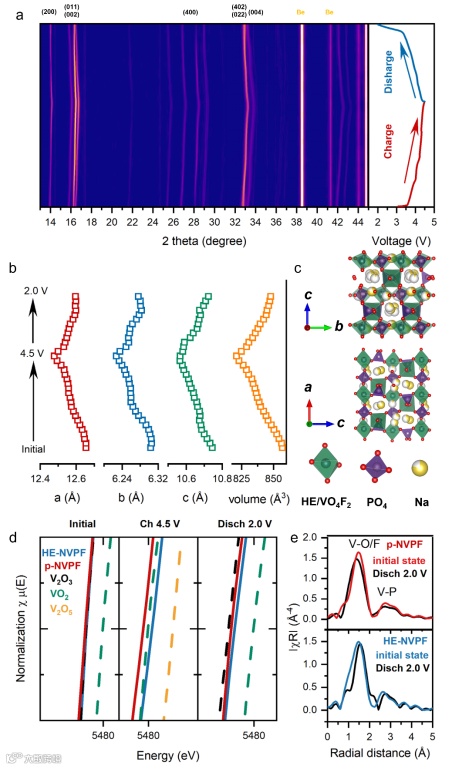 HE-NVPF在充放电过程中经历的是高度可逆的固溶相变过程,晶格体积变化小(<4%),这与原始NVPF在放电过程中出现的有害两相反应形成对比,这种稳定的固溶体机理是其优异性能的关键。同步辐射X射线吸收谱进一步证明了高熵掺杂所带来的可逆V3+/4+氧化还原过程,同时FT-EXAFS表明高熵掺杂有效抑制了在原始NVPF材料中出现的晶格扭曲。