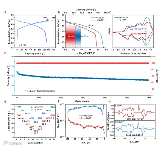 图2. (a) HE-NVPF在0.1 C下的充放电电压曲线。(b) HE-NVPF和p-NVPF高电压区域(>4.1 V)的比例。(c) HE-NVPF和p-NVPF第3循环的dQ/dV曲线。(d) HE-NVPF在10 C下的循环性能。(e) HE-NVPF和p-NVPF从1 C到30 C的倍率性能。(f) HE-NVPF和p-NVPF在不同SOC下的扩散系数。(g) p-NVPF和HE-NVPF的TDOS。