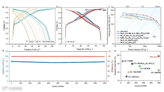 图4. 石墨//HE-NVPF全电池的电化学性能。(a) 从0.05 A g-1到3 A g-1的倍率性能。(b) 在20 mA g-1下20次循环的充放电曲线。(c) 钠离子全电池的Ragone图。(d) 在1 A g-1下的循环性能。(e) 钠离子电池全电池电化学性能总结。