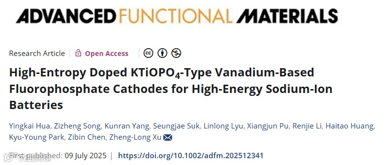 近日,来自香港理工大学的徐正龙教授团队在国际知名期刊Advanced Functional Materials上发表题为“High-Entropy Doped KTiOPO4-Type Vanadium-Based Fluorophosphate Cathodes for High-Energy Sodium-Ion Batteries”的文章。该文章报道了一种高熵掺杂的KTP型氟磷酸钒钠(HE-NVPF)正极材料 。该工作通过高熵策略,将多种元素(Fe, Mn, Ni, Al, Ca)微量掺杂到钒酸盐中,成功制备了单晶且无碳包覆的HE-NVPF材料 。该材料通过调控氧化还原中心的电子结构,获得了更高的工作电压和能量密度。在半电池中,其能量密度高达532 Wh kg⁻¹,并展现出3000次循环的长寿命。在与石墨负极匹配的全电池中,该材料同样表现出优异的能量密度和超过10000 W kg⁻¹的功率密度,展示了其巨大的实际应用潜力。