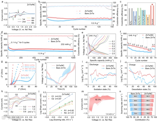 图3. (a) ZnTe/NC电极在0.1 mV s⁻¹扫描速率下的循环伏安曲线。(b) 在0.2 A g⁻¹电流密度下的循环性能。(c) 与近期报道的碲化物基钠离子电池负极材料在首次循环库伦效率方面的对比。(d) 在1.0 A g⁻¹电流密度下的循环性能。(e) ZnTe/NC电极在不同电流密度下的充放电曲线。(f) 倍率性能。(g) 循环前与循环100次后的电化学阻抗谱图。(h) ZnTe/NC与Bare ZnTe在(i)放电和(j)充电过程中对应钠离子扩散系数的恒电流间歇滴定技术曲线。(k) ZnTe/NC在不同扫描速率下的循环伏安曲线。(l) ZnTe/NC电极的log i(i为峰电流)与log v(v为扫描速率)关系图。(m) ZnTe/NC电极在1.0 mV s⁻¹扫描速率下的电容贡献占比。(n) Bare ZnTe与ZnTe/NC电极在不同扫描速率下的电容贡献占比。