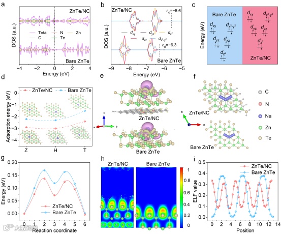 图5. (a) ZnTe/NC与Bare ZnTe的TDOS;(b) ZnTe/NC与Bare ZnTe的PDOS。(c) Bare ZnTe与ZnTe/NC中的d轨道能级。(d) ZnTe/NC与Bare ZnTe在不同吸附位点的钠离子吸附能。(e) ZnTe/NC与Bare ZnTe的差分电荷图。(f) ZnTe/NC与Bare ZnTe的扩散模型。(g) ZnTe/NC与Bare ZnTe的扩散能垒。(h) ZnTe/NC与Bare ZnTe的电子局域函数图;(i) ZnTe/NC与Bare ZnTe的电子局域函数值。