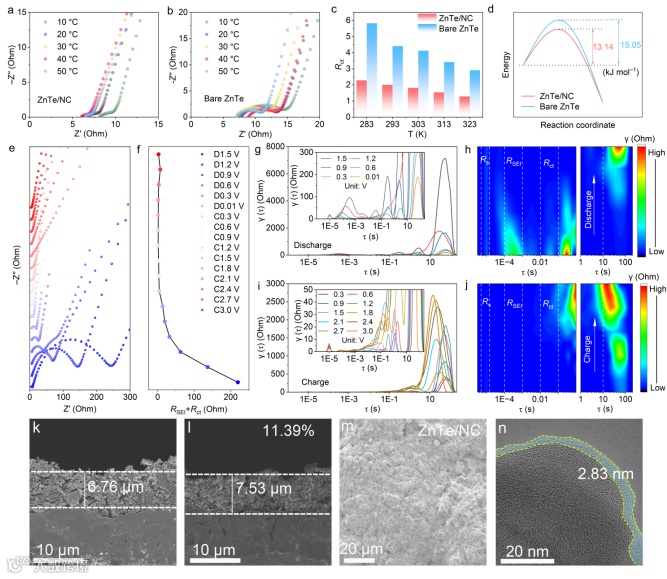 图4. (a) ZnTe/NC、(b) Bare ZnTe在不同温度下的奈奎斯特图谱。(c) ZnTe/NC与Bare ZnTe在不同温度下的电荷转移电阻(Rct)值。(d) ZnTe/NC与Bare ZnTe的活化能(Eₐ)值。(e) ZnTe/NC的原位电化学阻抗谱图谱。(f) ZnTe/NC的固体电解质界面电阻与电荷转移电阻之和(RSEI+Rct)。ZnTe/NC在(g, h)放电过程、(i, j)充电过程中的弛豫时间分布(DRT)曲线及相应的二维强度图。ZnTe在(k)循环前、(l)0.1 A g⁻¹电流密度下经过10次充放电循环后的截面扫描电子显微镜图像。(m) ZnTe/NC在0.1 A g⁻¹电流密度下经过10次充放电循环后的扫描电子显微镜图像。(n) 循环后ZnTe/NC的高分辨透射电子显微镜图像。