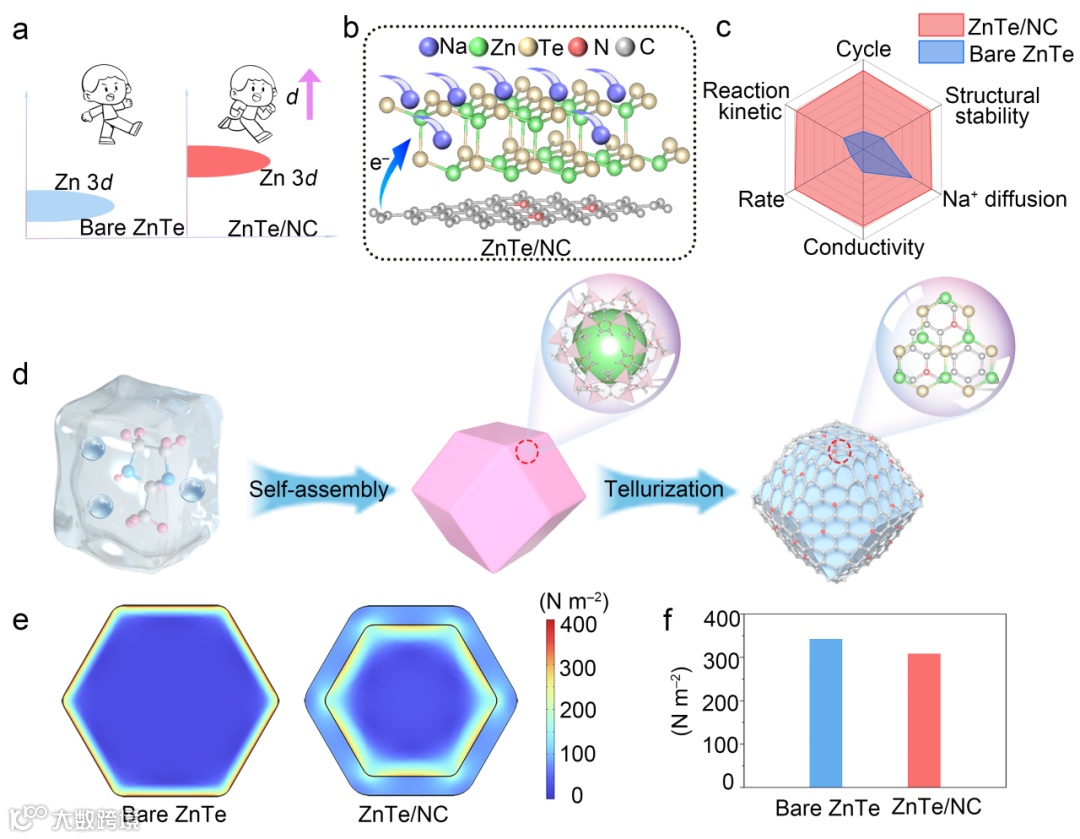 图1. (a) Zn 3d轨道中d带中心上移的示意图。(b) ZnTe/NC的结构示意图。(c) ZnTe/NC与Bare ZnTe在电化学性能、动力学及结构稳定性方面的程度对比。(d) ZnTe/NC详细制备过程的示意图。(e) Bare ZnTe与ZnTe/NC的应力分布。(f) Bare ZnTe与ZnTe/NC的最大应力。