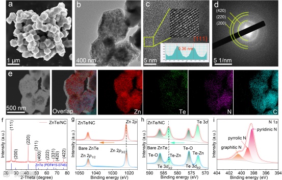 图2. (a) ZnTe/NC的扫描电子显微镜图像。(b、c) ZnTe/NC的透射电子显微镜图像和高分辨透射电子显微镜图像,以及(d) 相应的选区电子衍射图谱。(e) ZnTe/NC的高角环形暗场扫描透射电子显微镜图像及相应的X射线能谱(EDS)元素分布 mappings 图像。(f) ZnTe/NC的X射线衍射图谱。(g) ZnTe/NC与Bare ZnTe的Zn 2p X射线光电子能谱图谱,以及(h) Te 3d X射线光电子能谱图谱。(i) ZnTe/NC的N 1s X射线光电子能谱图谱。