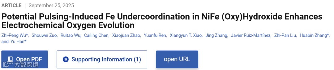 近日,沙特阿卜杜拉国王科技大学(KAUST)吴志鹏博士、张华彬教授团队联合华南理工大学韩宇教授,在国际顶级期刊《Journal of the American Chemical Society》发表了题为 “Potential Pulsing-Induced Fe Undercoordination in NiFe (Oxy)Hydroxide Enhances Electrochemical Oxygen Evolution” 的研究论文。该研究采用先进的同步辐射快扫XAFS技术,提出通过还原电位脉冲(RPP, reductive potential pulsing)方法,在NiFe (氧)氢氧化物中动态生成并维持高活性的低配位铁位点,从而显著提升OER活性和稳定性。这一策略在三电极溶液模型体系和阴离子交换膜水电解槽中均表现出了优异的效果,并在阴离子交换膜水电解槽中实现了超过180小时的高效稳定运行。