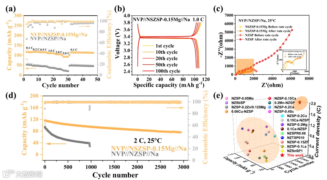 图 5. (a) 室温下0.1-5C倍率范围内的倍率性能;(b) 0.1C倍率下选定循环圈数的恒电流充放电曲线;(c) 倍率循环前后的Nyquist图谱;(d) 室温下以2C倍率进行3000圈循环的长循环性能;(e) NSZSP-0.15Mg与其他基于NZSP的固态电解质的循环性能对比。