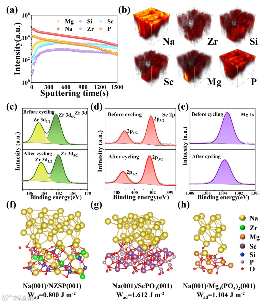 图 4. (a) Na沉积/剥离循环后NSZSP-0.15Mg表面的ToF-SIMS深度剖析图;(b) 对应的Na、Zr、Si、Sc、Mg、P元素三维分布模型图; NSZSP-0.15Mg 在 Na 沉积/剥离循环前后的XPS光谱:(c)Zr 1s;(d)Sc 2p;(e)Mg 1s;(f) Na/Na3Zr2Si2PO12、(g) Na/ScPO4 和(h) Na/Mg3(PO4)2界面的粘附功(Wad)模拟结果。