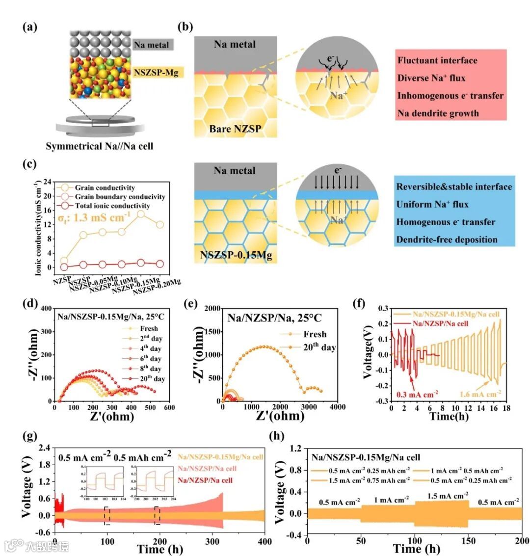 图 2. (a) 采用NSZSP-xMg作为固态电解质的对称Na//Na电池示意图;(b) NZSP/Na界面与NSZSP-0.15Mg/Na界面在钠沉积过程中的行为示意图;(c) 不同掺杂样品的离子电导率对比图;(d) Na//NSZSP-0.15Mg//Na电池与(e) Na//NZSP//Na电池在25℃ 下的时间分辨 Nyquist 图谱;(f) NZSP与NSZSP-0.15Mg的临界电流密度对比;(g) 以0.5 mA cm-2 电流密度进行恒电流循环的Na//Na电池性能对比(电解质分别为NZSP、NSZSP 与 NSZSP-0.15Mg);(h) Na//NSZSP-0.15Mg//Na电池在逐步提高电流密度条件下的恒电流充放电循环曲线。