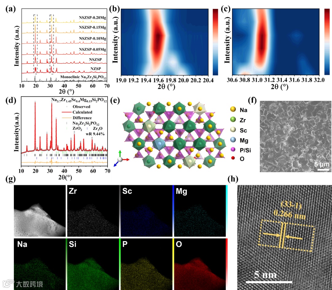 图 1. (a) Na3.4+2xZr1.6-xSc0.4MgxSi2PO12(x=0.05, 0.10, 0.15, 0.20)样品的XRD图谱;(b, c) 选定2θ区间(19-20.4°与30.3-35.0°)的XRD等高线图;(d) NSZSP-0.15Mg 的XRD图谱Rietveld精修结果;(e) NSZSP-xMg固态电解质的晶体结构示意图;(f) NSZSP-0.15Mg固态电解质的表面SEM俯视图;(g) NSZSP-0.15Mg固态电解质的TEM图及EDS元素分布图;(h) NSZSP-0.15Mg固态电解质的高分辨透射电镜(HRTEM)图像。