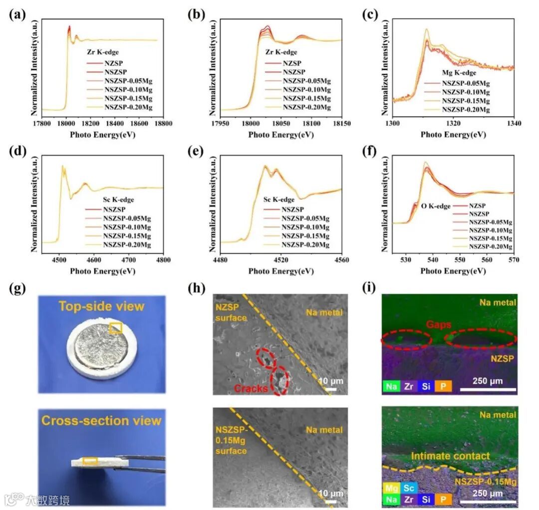 图 3. (a) NSZSP-xMg的Zr K边XANES光谱;(b) Zr K 边光谱的局部放大区域;(c) NSZSP-xMg的Mg K边XANES光谱;(d) NSZSP-xMg的Sc K边XANES光谱;(e) Sc K边光谱的局部放大区域;(f) NSZSP-xMg的O K边XANES光谱;(g) 循环后带钠覆盖层的 NSZSP-0.15Mg 固态电解质片材的俯视及截面示意图;(h) 与Na金属循环后的NZSP和NSZSP-0.15Mg的表面SEM图像;(i) 与Na金属循环后的NZSP和NSZSP-0.15Mg的截面 EM-EDS元素分布图。