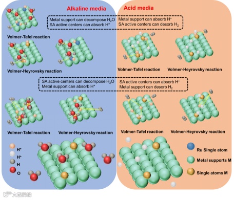 虽然酸性介质中存在大量的H+,但H2的生成需要先将H+转化为H* (Volmer反应),再通过吸附H形成H2。而酸性介质中催化剂的设计也需要串联完成两种反应途径(Volmer-Heyrovsky反应或Volmer-Tafel反应),在酸性介质中的研究主要集中在RDS,即H+生成H的步骤(Heyrovsky反应)或H-H(Tafel反应)。但在同一反应途径下,催化剂组分所起的作用也存在一定的差异,表现为SA活性中心对H有吸附作用,而金属载体有利于H+的吸附,或者SA活性中心有利于H+的吸附,金属载体解吸H2,即H转移和H溢出。因此制备催化剂的主要研究内容是活性位点的吸附和解吸能力与H之间的最佳平衡策略。