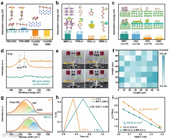 图2. a)通过密度泛函理论计算得到的PSS和Cu(220)表面非极性组分对DOL、DME的吸附能。b)锂离子在DOL、DME、MMT和PSS上的吸附能对比。插图:叠加电子密度分布轮廓的结构示意图。c)Li(110)金属在DME、DOL、MMT和PSS上的吸附能对比。插图:叠加电子密度分布轮廓的结构示意图。d)未干燥PSS液滴与溶剂润湿MS层的S 2p高分辨率X射线光电子能谱(XPS)图谱。e)H型电池实验装置(HS)光学图像:右侧HS上放置4毫升DOL/DME混合液,左侧HS上放置2毫升同种液体。数字图像中的圆点标记表示液位高度。f)通过MS层氧化Pt表面的DOL/DME时SECCM电流分布图。g)含MS-Cu或Cu的电解质在710-765 cm-1波数范围内的拉曼光谱。h)修饰有MS层与无MS层的双电层电容器脱溶性能对比。i)对称电池中修饰有MS层与无MS层的活化能Rct值对比。