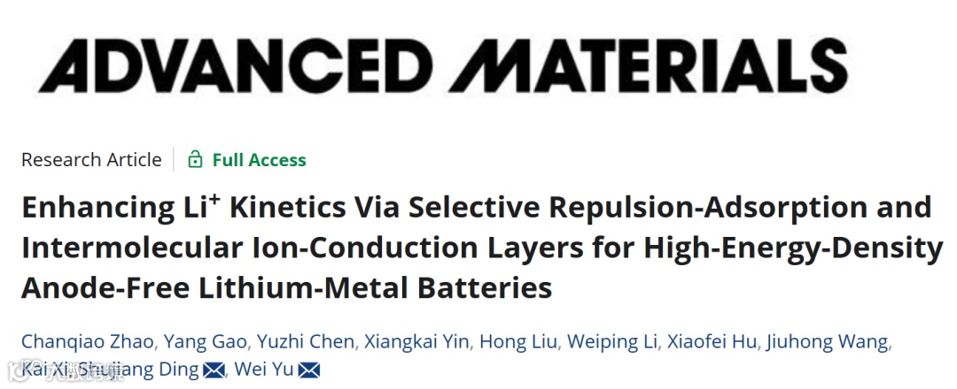 近日,来自西安交通大学的丁书江教授和于伟副教授,在国际知名期刊Advanced Materials上发表题为“Enhancing Li+ Kinetics Via Selective Repulsion‐Adsorption and Intermolecular Ion‐Conduction Layers for High‐Energy‐Density Anode‐Free Lithium‐Metal Batteries”的观点文章。该文章提出了一种由聚苯乙烯磺酸和蒙拓土复合而成的负极修饰层,改修饰层的选择排斥吸附作用和分子间离子通道可以提高无负极锂金属电池的界面反应动力学。