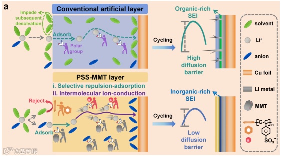 无负极锂金属电池虽然能量密度高,但因负极锂离子脱溶过程缓慢导致使用寿命有限。传统负极修饰层通过极性基团吸引锂离子,却会在这些极性层附近聚集溶剂分子,阻碍脱溶过程并形成离子传导性低的富有机固体电解质界面(SEI)。本研究提出一种选择性排斥吸附策略,采用由聚苯乙烯磺酸(PSS)和蒙脱石(MMT)组成的35纳米MS层。电喷雾制备过程中,PSS自组装时非极性苯环和C-H主链朝外,而磺酸基基团则埋藏于底层。非极性组分可排斥极性溶剂分子,带负电的MMT能吸附锂离子,抑制溶剂积聚并促进脱溶。同时,被MMT吸引的阴离子会形成离子传导性优异的富无机SEI。此外,PSS-MMT界面形成了快速锂离子传输通道,降低了迁移势垒。