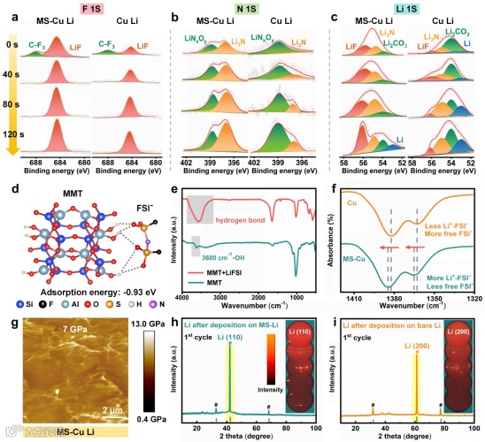 图4.使用XPS溅射刻蚀进行深度分布分析,展示沉积锂金属与MS层对比的SEI表面元素分布:a)锂金属表面F 1s电子态;b)锂金属表面N 1s电子态;c)锂金属表面Li 1s电子态;d)通过DFT计算的MMT-FSI−结合能;e)带有和不带LiFSI的MMT材料FTIR光谱;f)镀锂铜箔与MS层在电解液中的FTIR光谱。g) MS-Cu复合材料形成的SEI杨氏模量分布。半电池以1 mA·cm⁻²和1 mAh·cm⁻²电流密度循环5次后,在完全剥离状态下测试。h) MS-Li复合材料与i)裸露锂表面在首次循环时的沉积锂二维整体XRD分析及对应衍射图谱。