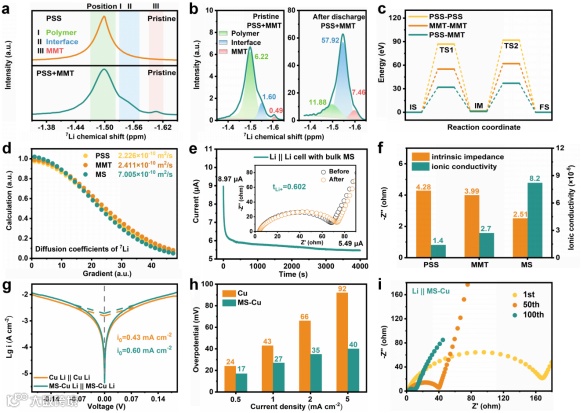 图3. a)原始状态下PSS和PSS+MMT的7Li SSNMR谱图。b)PSS+MMT放电前(左)与放电后(右)的7Li SSNMR谱图。c)锂离子在PSS-MMT、PSS-PSS及MMT-MMT中的能量景观图。(IS:初始态;TS1:第一过渡态;IM:插值模型;TS2:第二过渡态;FS:终态。)d)通过PGSE-NMR测试的PSS、MMT和MS中锂离子的扩散系数。e)对称电池中带有块状MS层的时序电流曲线,插图为直流极化前后的奈奎斯特图。f)PSS、MMT和MS的EIS测试所得本征阻抗及其对应离子电导率。EIS测试时,将相同厚度的金属层(MMT、PSS或MS)制备于两块不锈钢基板之间并浸润电解液。g)带有和不带MS层的对称电池的塔菲尔图。插图:交换电流密度(I0)计算结果。h)不同电流密度下带MS层和不带MS层半电池的过电位。i)带MS层半电池在不同循环次数下的EIS数据。