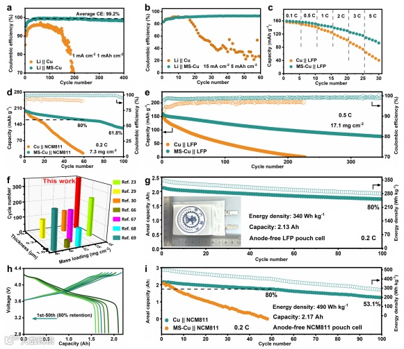 图6. a)带裸负极和MS改性负极的半电池在1 mA·cm-2和1 mAh·cm-2电流密度下均表现出循环效率(CE)。b)带裸负极和MS改性负极的半电池在15 mA·cm-2和5 mAh·cm-2电流密度下均表现出循环效率。c)无负极层的LFP电池在不同倍率(0.1-5 C)下的速率性能对比。d)无负极层Cu || NCM811与MS-Cu || NCM811电池的循环性能对比。e)MS改性与未改性无负极层LFP电池的循环耐久性对比。f)MS包覆电池与多数无负极层LFP电池在厚度、质量负载及循环稳定性方面的对比。g)无负极层Cu || LFP与MS-Cu || LFP 2.13 Ah软包电池(340 Wh/kg)的循环耐久性对比。插图:无负极层软包电池尺寸示意图。h)无负极层MS-Cu || NCM811 2.17 Ah软包电池(490 Wh/kg)在不同循环次数下的恒流充放电曲线。i)无负极层Cu || NCM811与MS-Cu || NCM811 2.17 Ah软包电池(490 Wh/kg)的循环性能对比。