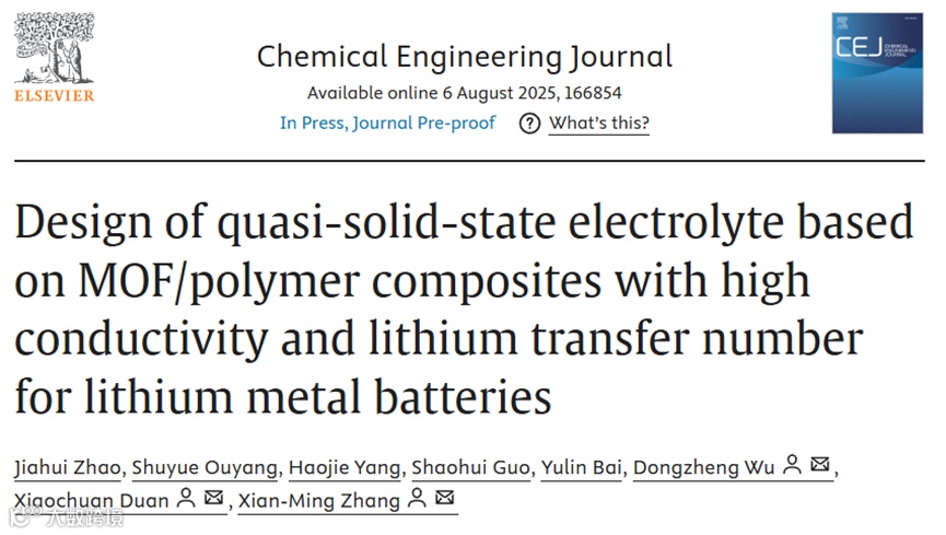 J. Zhao, S. Ouyang, H. Yang, S. Guo, Y. Bai, D. Wu, X. Duan, X.-M. Zhang, Design of quasi-solid-state electrolyte based on MOF/polymer composites with high conductivity and lithium transfer number for lithium metal batteries, Chemical Engineering Journal (2025) 166854.