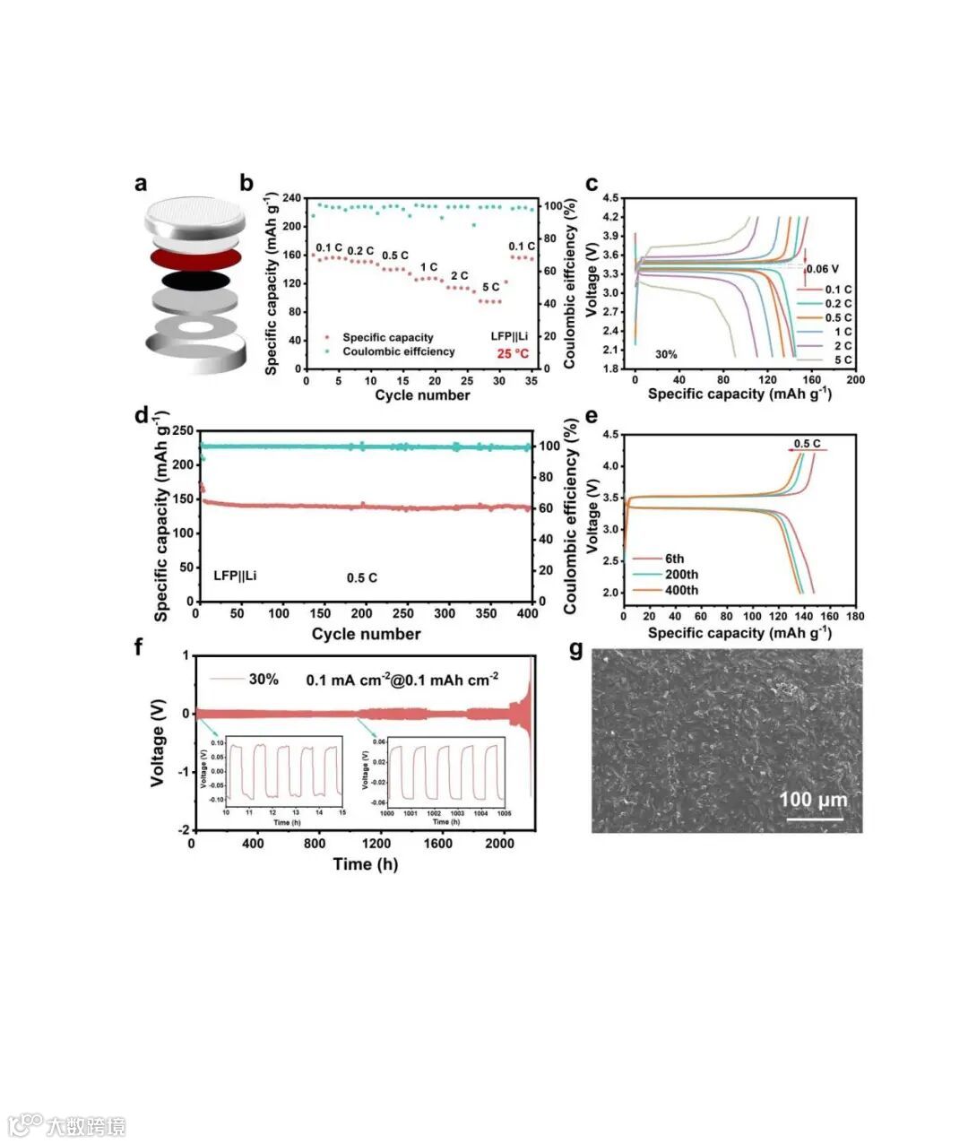 图5. 30%Cu-MOF/P-Li在25 °C下的电化学性能:(a) 集成30%Cu-MOF/P-Li的LFP||Li电池结构示意图;(b, c) LFP|30%Cu-MOF/P-Li|Li电池在0.1、0.2、0.5、1.0、2.0、5.0 C倍率下的循环性能及充放电电压曲线;(d) LFP|30%Cu-MOF/P-Li|Li电池在0.5C电流密度下的长期循环性能;(e) 含30wt% Cu-MOF/P-Li的LFP||Li电池在0.5 C和25 °C条件下第6次、200次和400次循环的电压曲线;(f) LFP|30%Cu-MOF/P-Li|Li电池在25 °C、0.1 mA cm-2电流密度下的性能;(g) 30%Li-MOF膜在0.5 C和25 °C下循环2200次后负极侧的SEM图像。