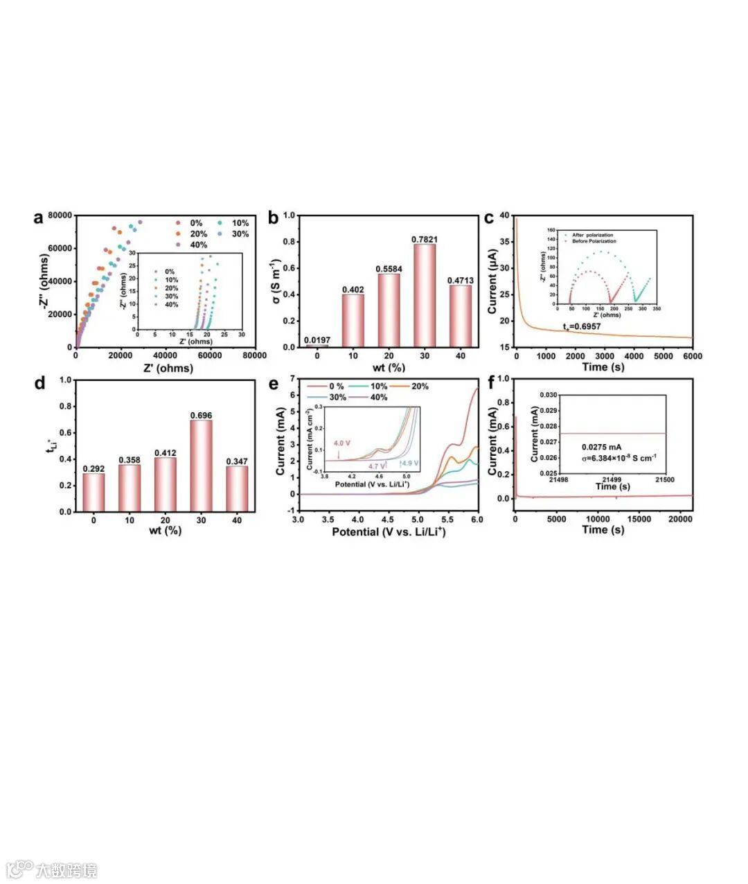 图4. (a) 不同Li-MOF含量的Cu-MOF/P-Li在25 °C下的电化学阻抗谱;(b) 不同Li-MOF含量的Cu-MOF/P-Li在25 °C下的离子电导率;(c) Li|30%Cu-MOF/P-Li|Li对称电池的直流极化测试结果及极化前后交流阻抗曲线;(d) 不同Li-MOF含量的Cu-MOF/P-Li在25 °C下的锂离子迁移数(tLi+);(e) 不同Li-MOF含量的Cu-MOF/P-Li在25 °C下的线性扫描伏安曲线;(f) 30%Cu-MOF/P-Li在25 °C下的电子电导率。