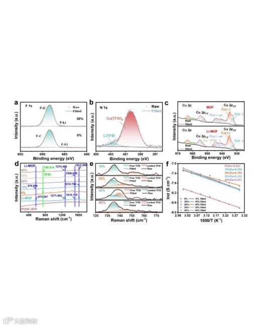 图3. (a) 30 wt% Li-MOF准固态电解质的XPS全谱;(b) Li-MOF中N 1s的XPS谱图及(c) MOF与Li-MOF中Cu 2p的XPS谱图;(d, e) 不同Li-MOF含量Cu-MOF/P-Li的拉曼光谱;(f) 不同温度下Cu-MOF/P-Li随Li-MOF含量变化的电导率曲线。