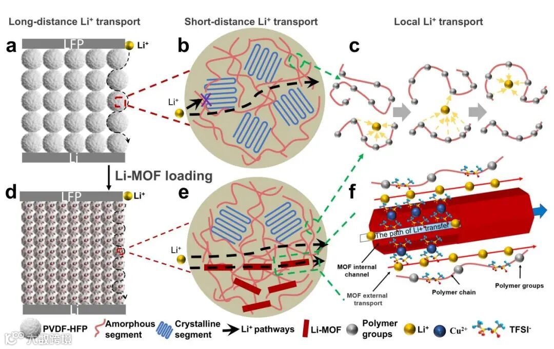 图1.MOF基复合固态电解质中的多种传输机制。(a) PVDF-HFP基电解质;(b) PVDF-HFP球晶内部组成结构;(c) 链段运动机制;(d) 掺入Cu-MOF-74的PVDF-HFP电解质;(e) 含Cu-MOF-74的PVDF-HFP球晶内部组成;(f) Li⁺在Cu-MOF-74中的传输过程。